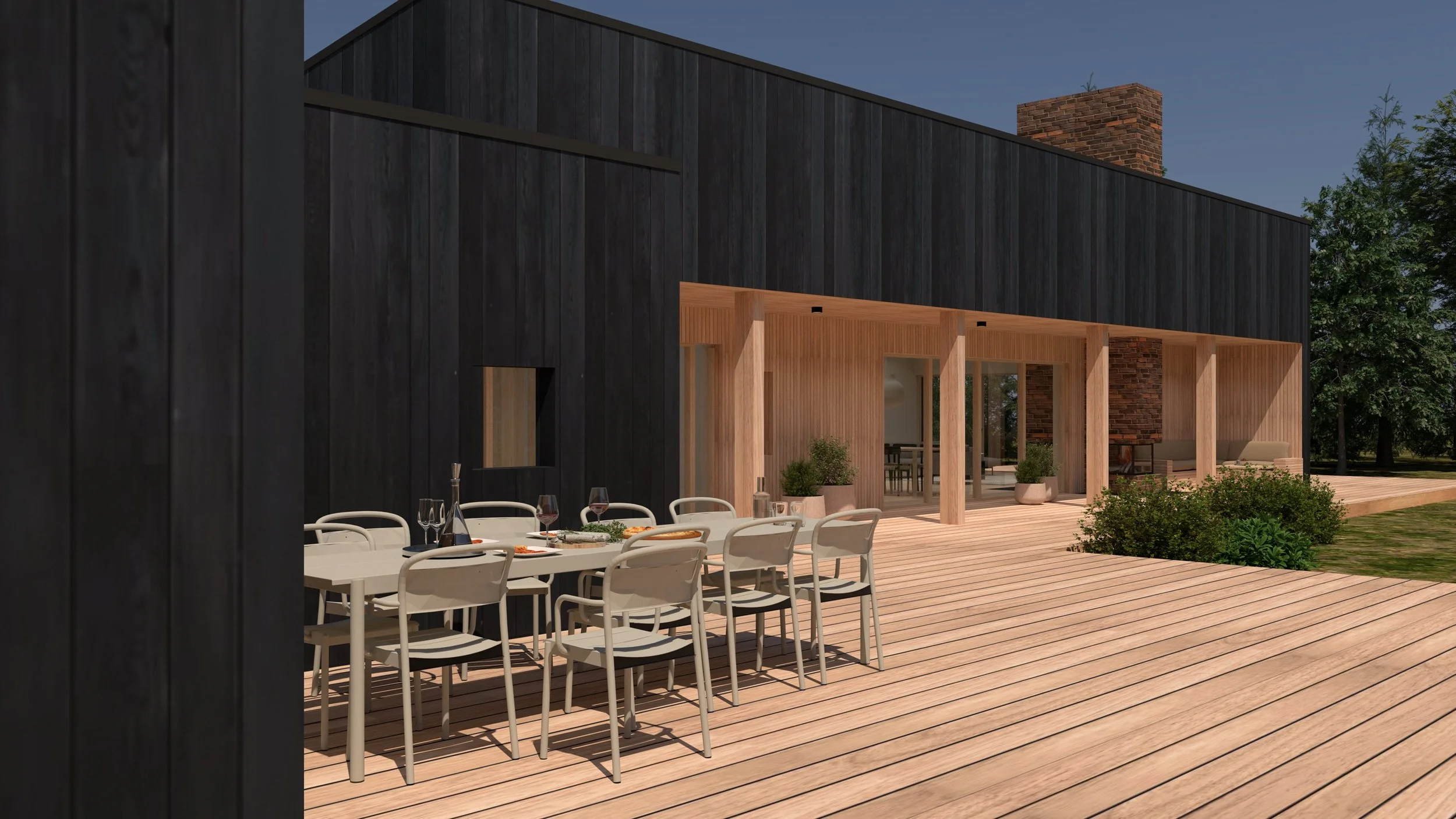 Markus og Cecilie’s havde et ønske om at skabe nogle udearealer, som skulle være et værdifuldt aktiv for huset og blive brugt fra morgen til aften. Huset er derfor designet, så ude og inde flyder sammen. Store glaspartier skaber en visuel forbindelse mellem de indvendige rum og arealerne udenfor, og døre i glaspartierne sikrer, at der er adgang til udearealerne fra både opholdsrum og værelser.