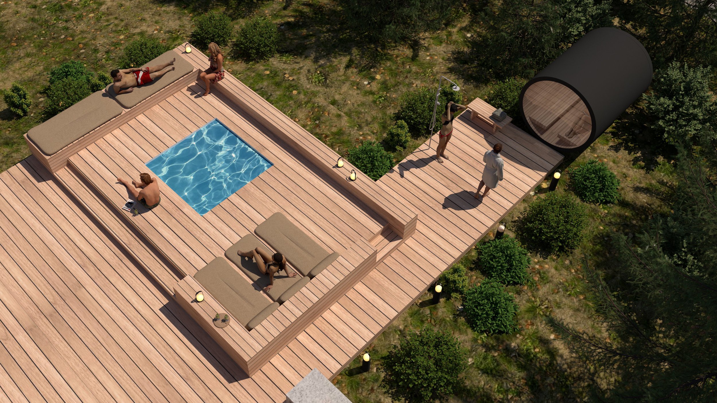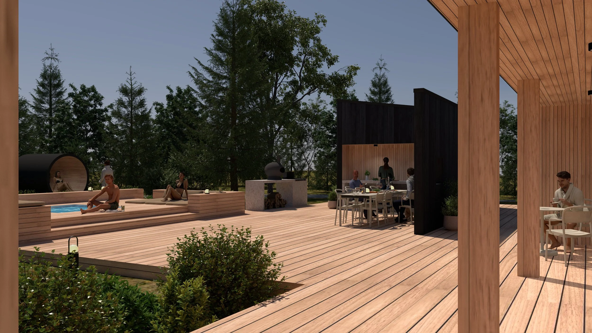 Husets udearealer består af en række unikke steder, som tilbyder forskellige kvaliteter, Man kan drikke sin morgenkaffe på den østvendte terrasse eller spise frokost under en parasol på den sydvendte terrasse. På den overdækkede terrasse langs hovedhusets vestevendte facade er der placeret en udepejs samt et indbygget lounge, og sidst men ikke mindst er der indrettet et udendørskøkken og et spiseareal ved annekset samt et hyggelig loungeområde omkring den lille spapool.