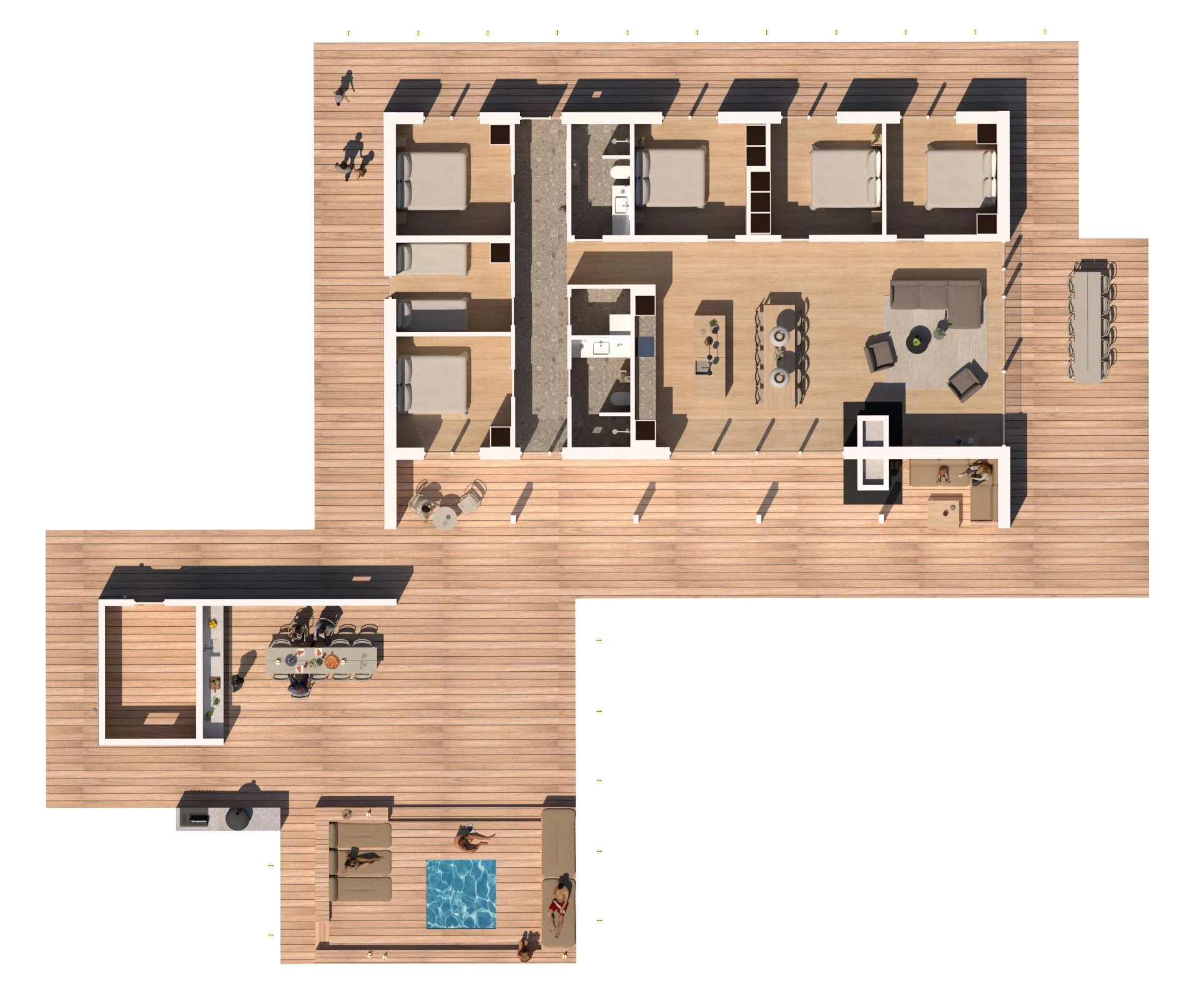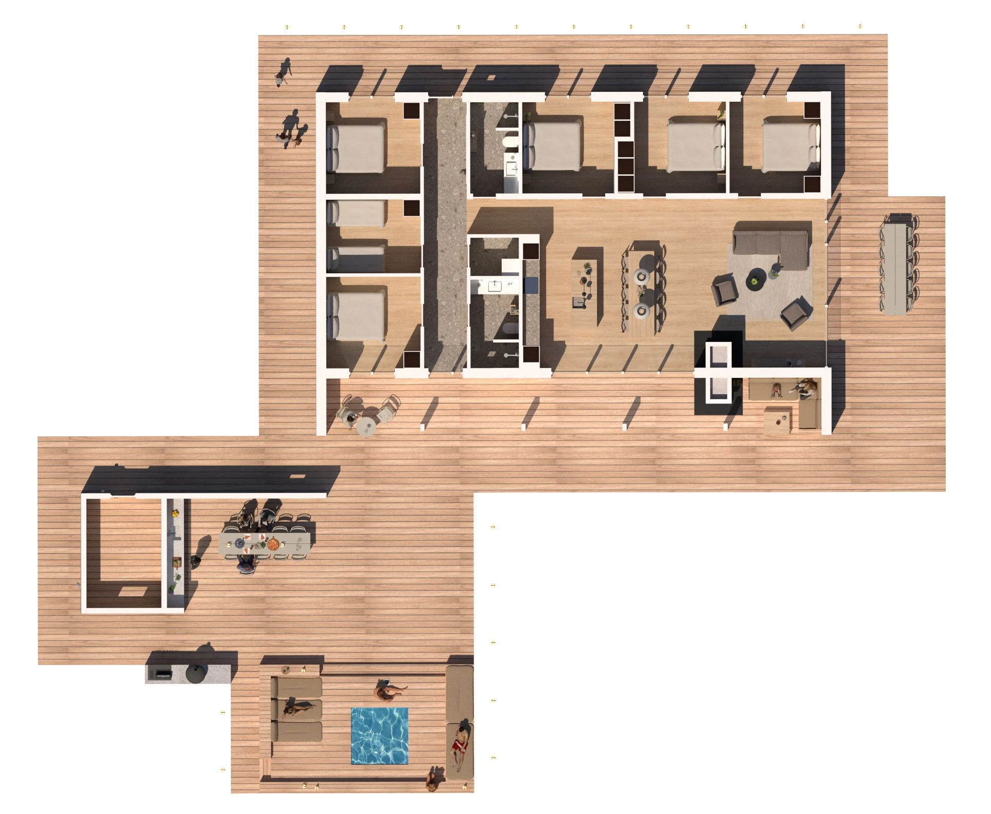 Sommerhuset er designet med udgangspunkt i to primære parametre: 1. huset skal udgøre en ramme, hvor mange gæster skal kunne opholde sammen og hver for sig og 2. ligegyldigt hvor man opholder sig, skal man have en god oplevelse - alle steder skal være smukke, indbydende og hyggelige.